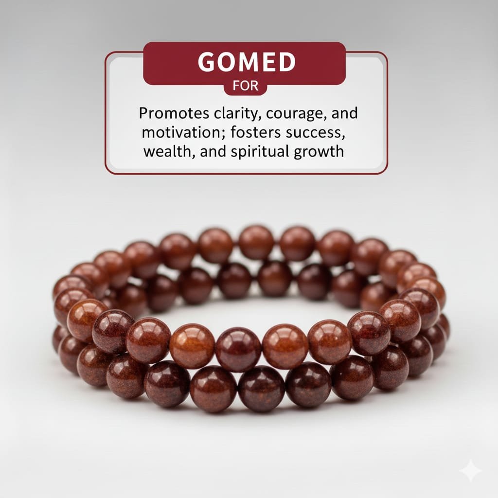 Gomed, yaani Hessonite Garnet, ek powerful gemstone hai jo clarity, courage aur motivation ko enhance karta hai. Ye bracelet un logon ke liye perfect hai jo apne career mein success chahte hain aur spiritual growth ke raaste par hain. Iske reddish-brown beads not only look elegant but also radiate grounding energy that helps you stay focused and fearless.