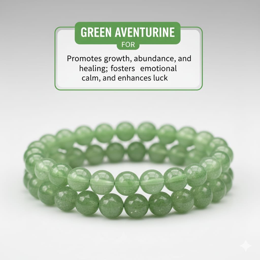Green Aventurine bracelet prosperity aur emotional healing ke liye pehchana jaata hai. Iske lush green beads aapke heart chakra ko soothe karte hain aur luck ko attract karte hain. Ideal for new beginnings and financial ventures.